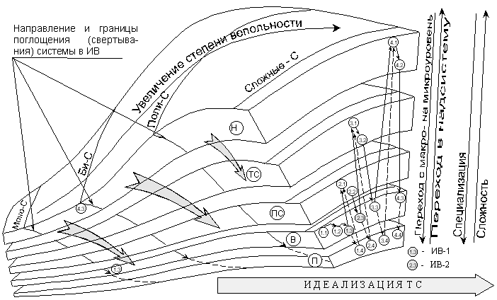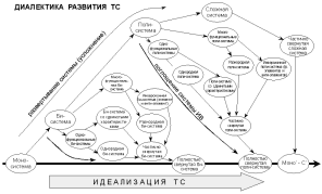 До сих пор в ТРИЗ идеализацию ТС рассматривали как процесс развития ТС по пути уменьшения М,Г,Э и увеличения числа функций. Однако такой взгляд не полностью отражает реальное развитие ТС в направлении увеличения степени идеальности. Кроме того, он не позволяет выявить самого механизма идеализации. А такой процесс при развитии ТС как их усложнение, рассматривался как уменьшение идеальности ТС. Такое положение приводило к противоречию между основным положением теории и реальным развитием ТС, к столкновению тенденций развития. Временно это противоречие было разрешено таким объяснением: усложнение ТС происходит в надсистеме, а в оперативной зоне идет процесс идеализации ТС. Однако на самом деле такое усложнение всего лишь один из путей выявления функций будущего идеального вещества или процесса. Анализ логики развития ряда технических систем показал, что их развитие в направлении повышения идеальности проходит два основных этапа: развертывания ТС путем усложнения их с целью поиска функций будущей ИТС и поглощения (или свертывания) ТС идеальным веществом этой системы, появляющимся в процессе развития (идеализирующийся как наиболее низкий ранг ТС, идущий в авангарде развития ТС). Формально процесс развития реальной ТС может быть записан выражением: