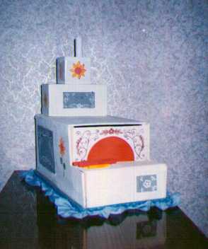 "СВЕТОФОР"Авторы проекта: Юхневич Светлана, Ярмонова Ольга.Кукла представляет собой не одну игрушку, а целый комплекс материалов самого различного назначения: развития мелкой моторики рук, упражнения в навыках самообслуживания, закрепление умений ориентироваться в цвете, обучение цветовому моделированию. Сама по себе кукла может быть использования как театральная игрушка, а пирамида, которая служит ей основанием, как наборное полотно и часть игрушки "Маяк". Маяк снабжён прозрачными кармашками для демонстрации мелких картинок. Верхняя крышка его открывается. Авторы максимально использовали ресурсы формы пирамиды: достаточно перевернуть её и опустить боковые грани, чтобы получить третью модификацию - "Светофор". Светофор электрофицирован, работает на батарейках, у него по желанию играющего загораются все три огонька. Игрушка изготовлена из тонкой фанеры и ткани.