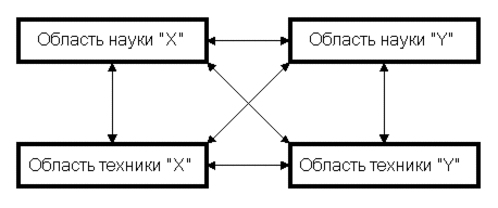 Рис. 40. Взаимодействие между различными областями науки и техники На приведенном выше примере открытия атома нетрудно выявить такие взаимовлияния. Рассмотрим еще несколько примеров. На рубеже XVI-XVII вв. была создана новая техническая система - микроскоп. В конце XVII века голландский мастер А.Левенгук довел увеличение микроскопа до 300 раз, и это техническое изобретение произвело подлинный переворот в биологии, дало жизнь микробиологии. Но и современная биология накопила огромный потенциал знаний, которым может щедро поделиться с техникой будущего. Уже сейчас разрабатываются методы извлечения металлов из руды и морской воды с помощью микроорганизмов. В нашей стране созданы первые действующие модели биоэлектростанций на ферментах с к.п.д. 80-90%! Во многих странах разрабатываются высокочувствительные биодатчики на базе растительных и животных тканей для обнаружения различных веществ и излучений. Захватывающие перспективы открываются в области создания биокомпьютеров. Возникла даже новая область техники - биоэлектроника или молекулярная электроника. Но и это не предел. Одна хромосома человека при объеме чуть более 10 кубических микронов хранит информацию, для размещения которой потребовалось бы четыре тысячи томов по пятьсот страниц в каждом! Фантастическая плотность информации, перед которой самые перспективные запоминающие устройства - НИЧТО! Итак, появление нового становится возможным, как только в общем уровне развития науки и техники возникают соответствующие предпосылки. Кстати, именно этим и объясняется эффект параллельных открытий и изобретений, когда люди, работая независимо друг от друга, почти одновременно приходят к одному и тому же результату. Вот несколько таких примеров. 1846 год. Астрономы Ж.Леверье и Дж.Адамс независимо друг от друга предсказали существование планеты Нептун. 1859 год. Биологи Ч.Дарвин и А.Уоллес независимо друг от друга сформулировали основные положения теории эволюции. 1876 год. А.Белл заявил на изобретение телефона. Два часа спустя (!) с той же идеей в Патентном бюро появился Э.Грей. 1897 год. В январе немецкий физик Э.Вихерт открыл электрон, а три месяца спустя о свое открытии сообщил Томпсон. 1954 год. Физики А.М.Прохоров, Н.Г.Басов и Ч.Таунс почти одновременно создали квантовый генератор. 1962 год. Советский физик Ю.Н.Денисюк и сотрудники Мичиганского университета Э.Лейт и Ю.Упатниекс получили первые голографические изображения. С точки зрения проблемы правильного выбора творческой Цели необходимо упомянуть и о противоположных примерах, когда попытки открытий и изобретений оставались незамеченными или вообще не достигали своей цели. Первая половина XIII века. Иордан Неморарий сформулировал основные законы движения, которые четыре века спустя заново переоткрыл Галилей. Первая половина XIX века. Английский математик Ч.Бэббидж сформулировал принципы работы вычислительной машины и разработал проект механического "компьютера". Реализовать идею на механическом уровне было невозможно. Только достижения электроники позволили к 1946 году построить первый компьютер. 1868 год. Французский ученый Н. де Сен-Виктор обнаружил потемнение фотопластинки в присутствии солей урана. Но сообщение было забыто, поскольку наука еще не приблизилась к необходимости понимания глубинных основ строения вещества, возникше
